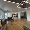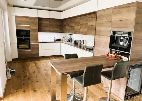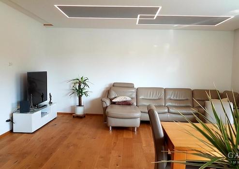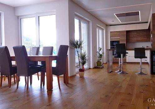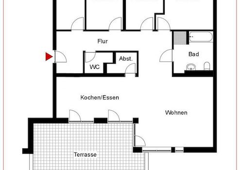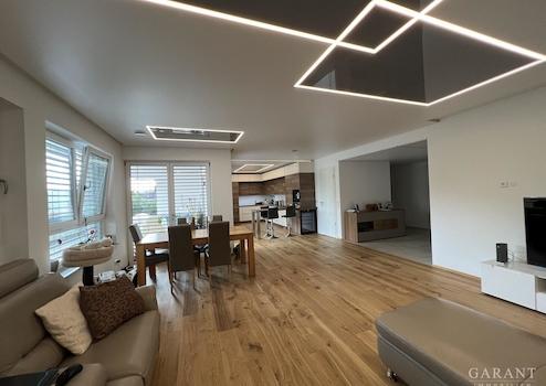 In dieser großzügigen Wohnung hat die ganze Familie Platz um sich zu entfalten. Über die Eingangstür kommen Sie in einen breiten Flur zu den 4 Schlafzimmern. Das separate Gäste-WC mit Dusche ergänzt das große, moderne Hauptbad. Bei mehreren Familienmitgliedern ist ein zweites Bad für alle ein Segen. Der Flur, modern gefliest, geht über in den großen Wohn-/Essbereich mit neuwertiger, wunderschöner Einbauküche mit Theke und hochwertigen Elektrogeräten. Neben der Gefrier-/Kühlkombination gibt es noch einen Kühlschrank für Getränke. Die Kaffeemaschine ist in die Küche integriert - sehr außergewöhnlich und praktisch. Daneben haben Sie einen Hauswirtschaftsraum mit Anschluss für Waschmaschine und Trockner sowie Vorräte oder andere wichtige Dinge für den Haushalt. Hier befindet sich auch die Umluftanlage für Ihre Wohnräume. Vom großen, hellen Wohn-/Essbereich, ausgelegt mit einem hochwertigen Parkettboden, schauen Sie ins "Grüne" oder können von hier aus auf Ihre über 30 qm große Terrasse gelangen. Hier kann man nach der Arbeit entspannen und mit der Familie oder Freunden den Tag ausklingen lassen. Ihre Wohneinheit hat ebenso elegante Spanndecken mit eingelassener, indirekte Beleuchtung (mit funkgesteuerten LED-Leuchten), ein Detail, das dieser Wohnung einen ganz besonderen Flair gibt.