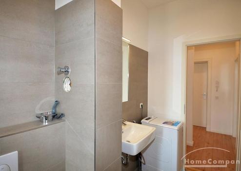 Ein-Zimmer-Wohnung in Wedding. Vollständig möbliert mit Bett, Tisch und Waschmaschine. Modern gefliestes Badezimmer mit Wanne. Viel Stauraum bietet der große Flur.