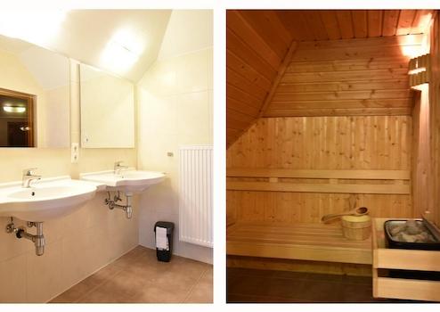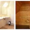 Bad 2 ist ein Luxusbad mit einer echten finnischen Sauna. Außerdem hat dieses Badezimmer 2 Waschbecken und eine Dusche.