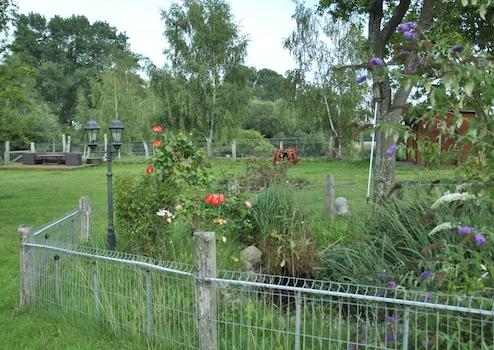 Vor der Reiterstube lädt ein Gästebereich mit Sitzmöglichkeiten, Grill- und Feuerstelle zum Entspannen ein. Des Weiteren gibt es einen Gäste-/Urlauberbereich mit mehreren Blockhütten die wie folgt aufgeteilt sind. Zwei miteinander verbundene Hütten (3 x 4 m) mit je einem Doppelbett, einer Mehrzweck Hütte (4 x 4m) mit TV und Sitzmöbeln. Separat stehen zwei weitere Blockhütten (a‘ 2 x 2 m) mit einer Einbau-küche und einem Bad (Dusche). Dieser gesamte Bereich ist fest eingezäunt und für Gäste mit Kindern und Haustieren gut geeignet.