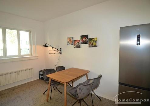 Schöne Zwei-Zimmer-Wohnung in der Nähe des Parks Rehberge in Berlin. Die Wohnung ist möbliert und verfügt über ein Schlafzimmer und ein Wohnzimmer. Waschmaschine und Geschirrspüler sind vorhanden. Im Wohnzimmer gibt es einen Essbereich und ein großes, gemütliches Sofa. Die Küche ist sehr geräumig und bietet einen weiteren, kleinen Esstisch.