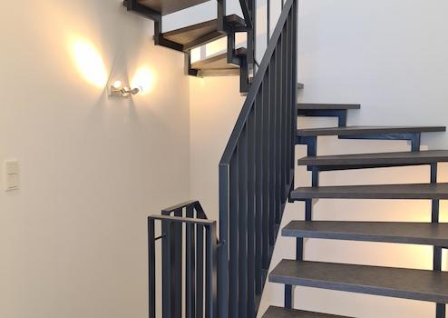 - Innentreppe: Stahltreppe mit massiven und modernen Holzstufen aus Eiche