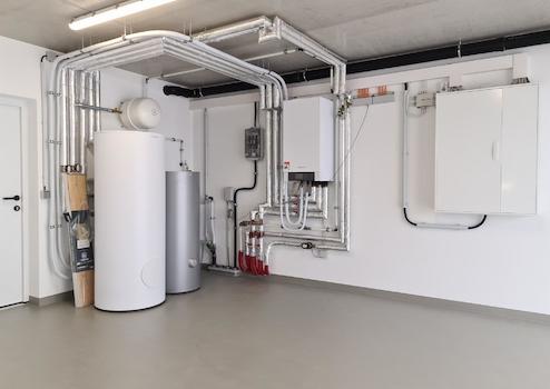 die Heizung ist im EG sowie im OG als Fußbodenheizung ausgelegt, die Wärmeverteilung im Studioraum des DG erfolgt über Heizkörper.
