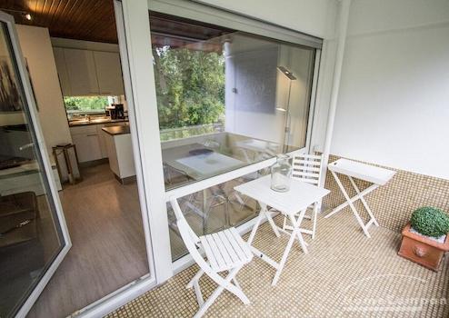 Das großzügige Wohnzimmer verfügt über eine integrierte Einbauküche. Der Balkon bietet einen freien Blick ins Grüne.