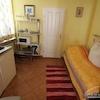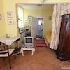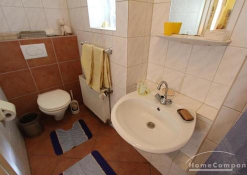 Pantryküche mit Sitzecke, weiß gefliestes Tageslichtbad mit Dusche.