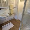 Ein Wohn- und Schlafbereich, Pantry-Küche mit Esstisch, kleines Tageslicht-Duschbad.