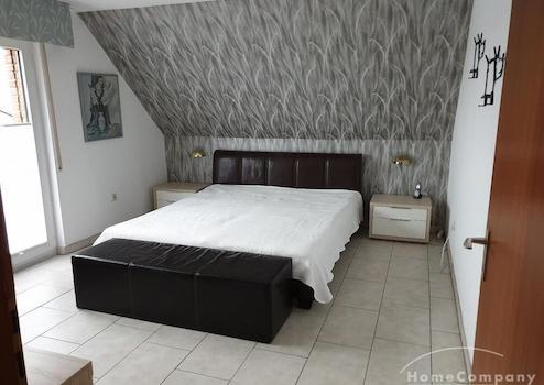 Im Obergeschoss gibt es drei Schlafzimmer (von einem der Schlafzimmer kann man den Balkon betreten) sowie ein Ankleidezimmer und ein Bad mit Rundbadewanne. Zwei der drei Schlafzimmer haben einen TV.