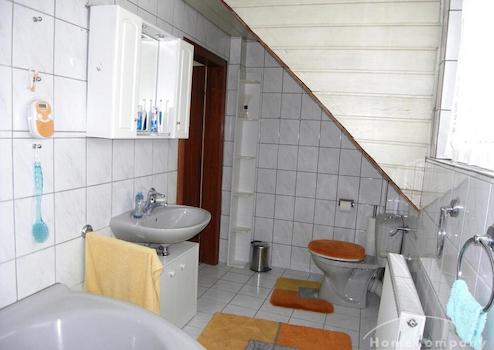 Im Erdgeschoss befinden sich Wohn-/Esszimmer mit Kaminofen, TV und elektrischen Rollläden. Angrenzend gelangt man in die Küche (Einbauküche inkl. Spülmaschine und Mikrowelle) sowie über den Flur ins Gäste-WC (mit Fenster).