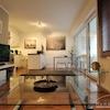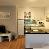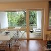 Das großzügige Wohnzimmer verfügt über eine integrierte Einbauküche. Der Balkon bietet einen freien Blick ins Grüne.