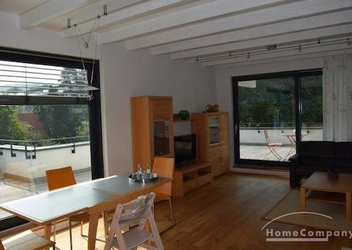 Vom gemütlich eingerichteten Wohn/Ess-Zimmerbereich mit Kamin, hat man den direkten Zugang auf die große teils überdachte Dachterrasse (ca.100m2).