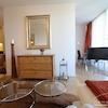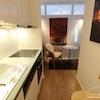 Es gibt einen abgetrennten Küchenbereich mit eine gemütlichen Essecke, eine kleine Diele und ein schickes Wannenbad. Die Möblierung ist geschmackvoll aufeinander abgestimmt.