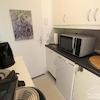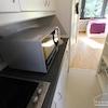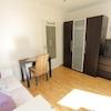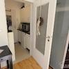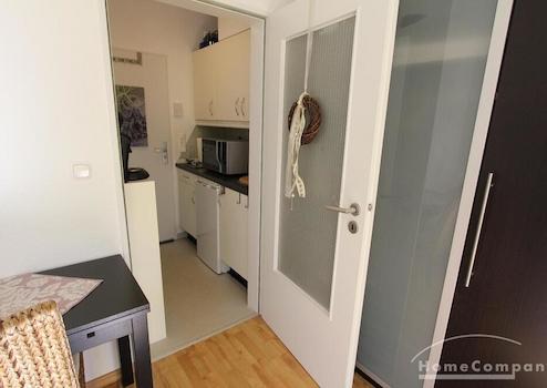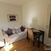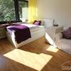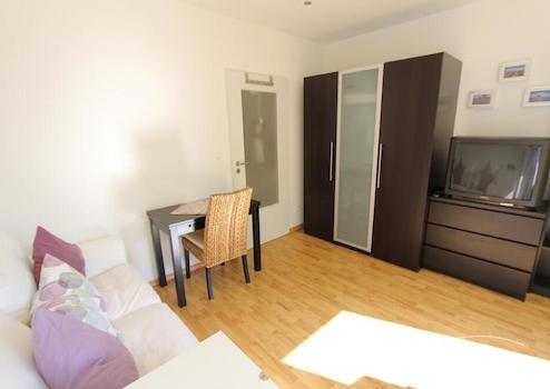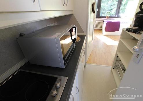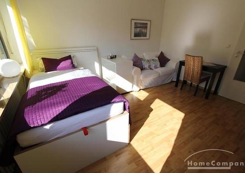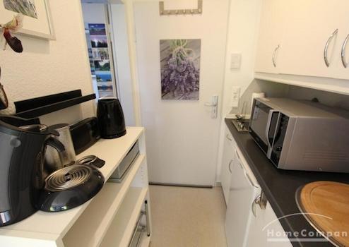 Perfekt für Pendler: kleines Appartement in einem Mehrfamilienhaus gelegen, Wohn-Schlafraum mit Blick in den Garten, zeitlose Möblierung, kleine Küchenzeile im Eingangsbereich.