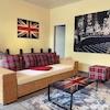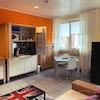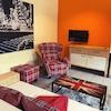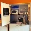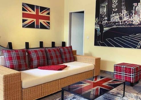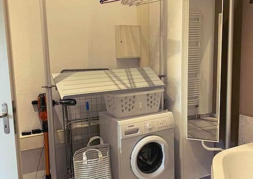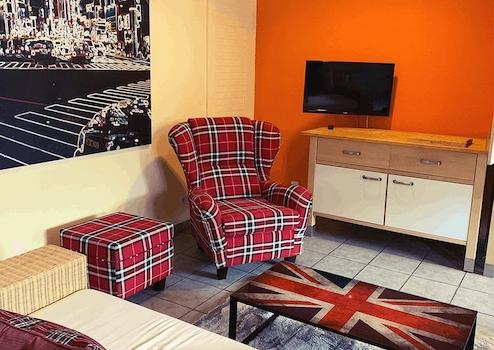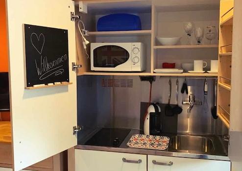 Großzügiger Wohn-/Schlaf-/Arbeitsraum mit Ausziehtisch zum Arbeiten und Essen, Schrankküche mit Mikrowelle und Kühlschrank, Schlafsofa, Schlafsessel mit Beistelltischen, diversen Regalen, Jugendstil Vertiko, TV-Gerät, TV über Satellit. Getrennter Toiletten und Bad-teil. Bad mit Badewanne und Waschmaschine sowie Kleiderablagemöglichkeit in offener Bauweise. Die Wohnung ist mit elektrischen Rollladen ausgestattet. Heller Fliesenboden im gesamten Wohnbereich. Internetzugang vorhanden.