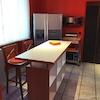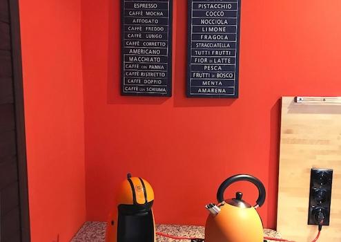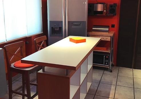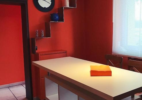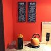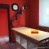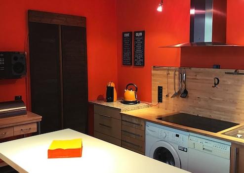 Die Wände sind in einem Wohlfühlorange gehalten und mit dem frei gestaltbaren Essplatz wird ein gewisses Barfeeling vermittelt.