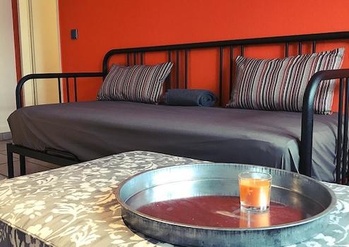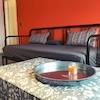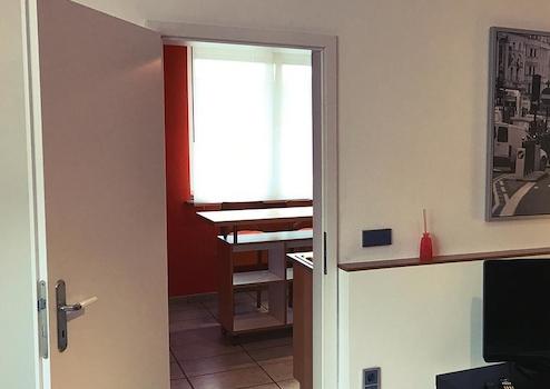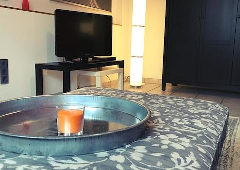 Im Wohn-/Arbeitsraum gibt es ein Bett, welches auch als Sofa genutzt werden kann,sowie einen Sessel, einen Kleiderschrank und TV-Gerät (TV über Satellit).