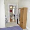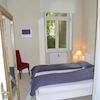Das separate Schlafzimmer mit Duschbad und 140er Bett liegt sehr ruhig zum Garten.