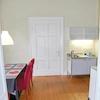 Geräumige 2-Zimmer-Wohnung im Erdgeschoss: Wohnküche mit Küchenzeile und Esstisch geht ins Wohnzimmer mit Arbeitsecke und TV-Gerät über und hat einen wunderbaren Holzdielenboden.