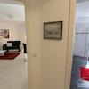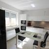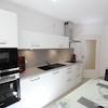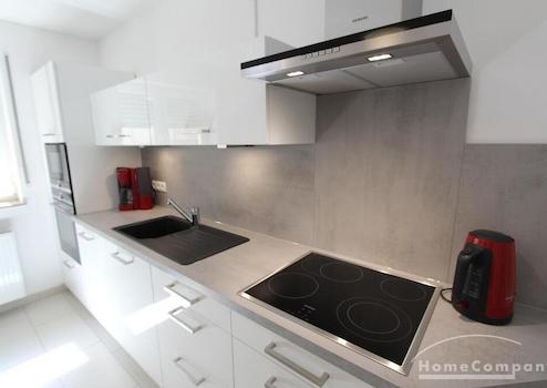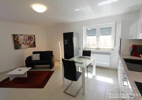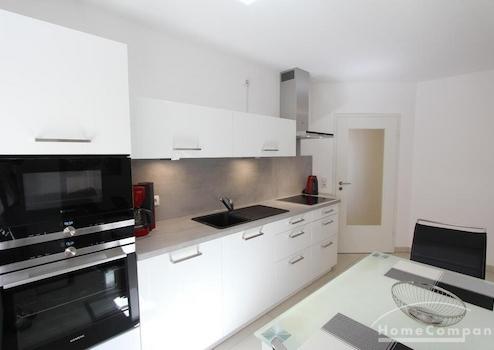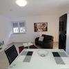 Das Herzstück der Wohnung ist die Wohnküche mit einem gemütlichen Ledersofa, Flachbildfernseher und einer voll ausgestatteten, integrierten Einbauküche (weiße Lack-Front) mit Glas-Esstisch.