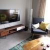 - Wohnzimmer mit großem Schreibtisch und Fernseher