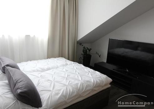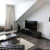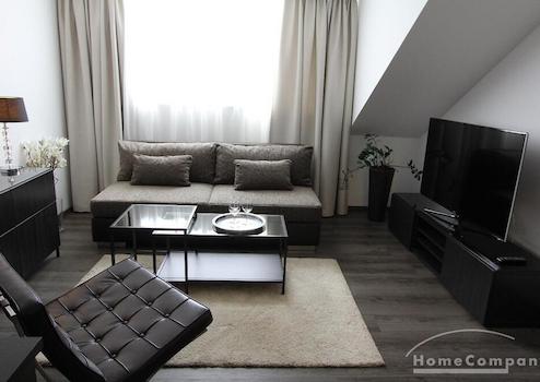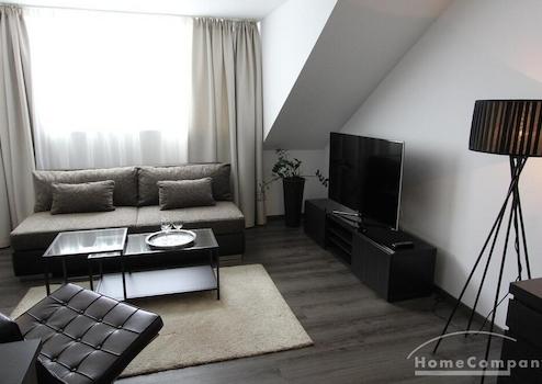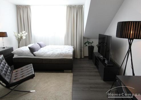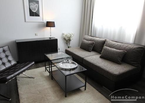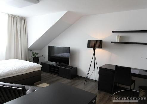 1-Zimmer-Appartment, in dem für das Leben alles Notwendige Platz findet: tagsüber dient das Zimmer (u. a. ausgestattet mit einem gemütlichen Sofa, Couchtisch, Ledersessel, Flachbildfernseher) als Wohnbereich. Die offene und moderne Pantryküche wird von einem halbhohen Bartisch optisch vom Rest des Raumes abgetrennt. Abends kann das Sofa als großzüges Bett ausgezogen werden, so dass man das Zimmer durch cleveres Umstellen der Möbel in einen Schlafbereich verändern kann.