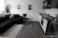 zur einen Seite Wohnbereich mit großer Sitzlandschaft, Schreibtisch, Flachbildfernseher und zur anderen Seite Pantryküche mit Ceran-Elektroofen, einer großen Kühl-Gefrierkombination, Kaffeemaschine.