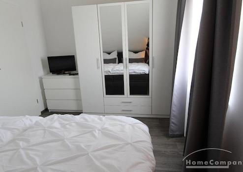 Dachgeschoss-Wohnung, modern in weiß, silbrig und grauen Farben eingerichtet. Helles Schlafzimmer mit Doppelbet und großer Schrankwand.