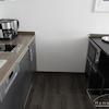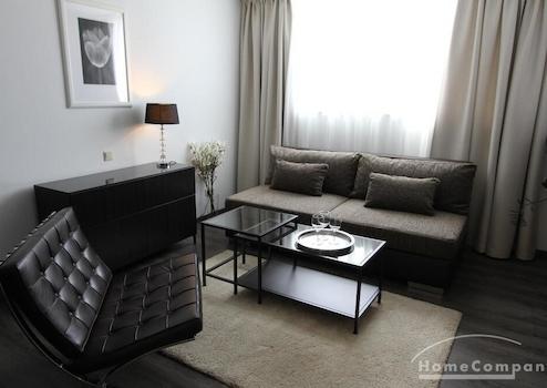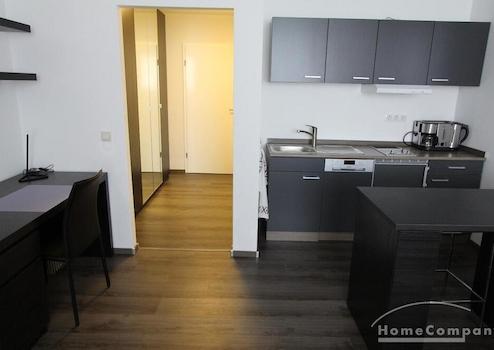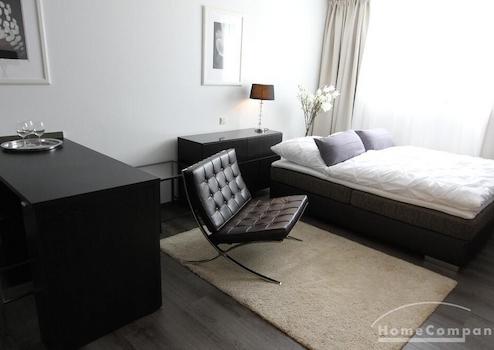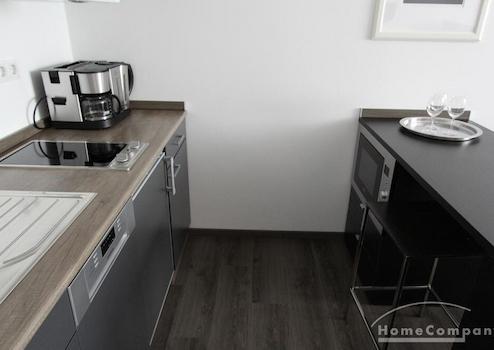 1-Zimmer-Appartment, in dem für das Leben alles Notwendige Platz findet: tagsüber dient das Zimmer (u. a. ausgestattet mit einem gemütlichen Sofa, Couchtisch, Ledersessel, Flachbildfernseher) als Wohnbereich. Die offene und moderne Pantryküche wird von einem halbhohen Bartisch optisch vom Rest des Raumes abgetrennt. Abends kann das Sofa als großzüges Bett ausgezogen werden, so dass man das Zimmer durch cleveres Umstellen der Möbel in einen Schlafbereich verändern kann.