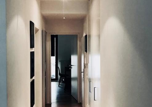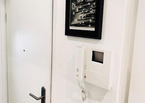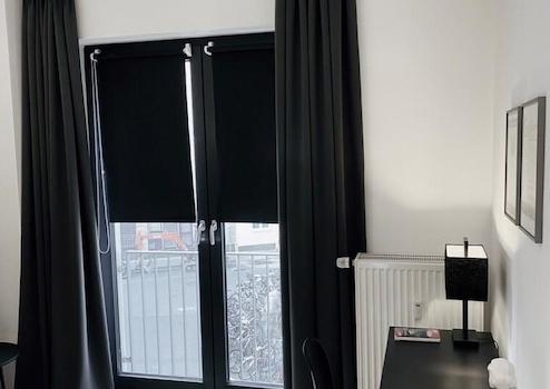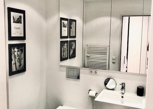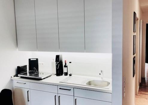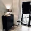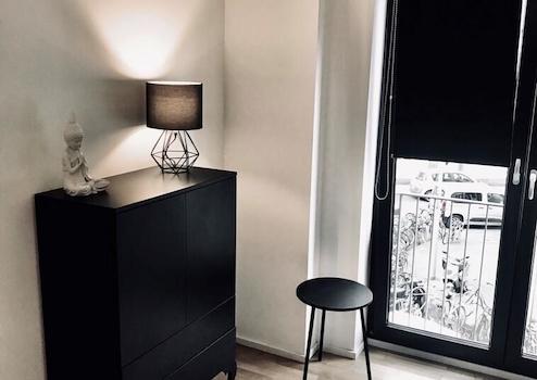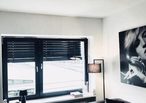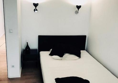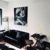 Die 2-Zimmer-Wohnung mit extra hohen Decken und Einbauspots ist hochwertig ausgestattet mit Highspeed W-Lan, elektrischen Jalousien, zwei Flatscreen TV sowie Kamerasystem (Hauseingang). Die Möbel und Einrichtung ist schwarz-weiß gehalten.
