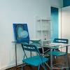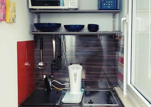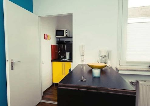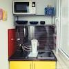 - Eine separate kleine Küche mit Küchenzeile (Kühlschrank, Ceranfeld, Mikrowelle, Wasserkocher) und Ablagemöglichkeit. Etwas abgetrennt davon befindet sich eine Küchentheke für Geschirr und Kühlschrank.