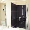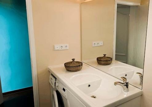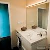 - Ein neues Bad mit Duschwanne und großem Waschbeckenunterschrank, in dem die Waschmaschine verstaut ist.