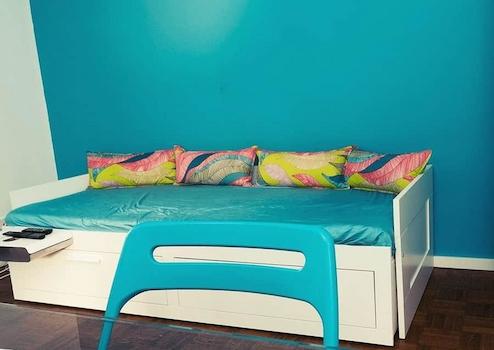 - Einen gemütlichen Wohn-/Schlaf-/Arbeitsraum mit einem Bett zum Ausziehen, einer Sitzmöglichkeit zum Essen/Arbeiten und einem gemütlichen Sessel. Ein begehbarer Kleiderschrank mit Regalen, Kleideraufhängung und diverse Regale bieten ausreichend Stauraum.