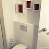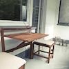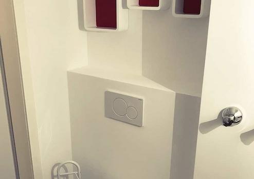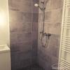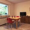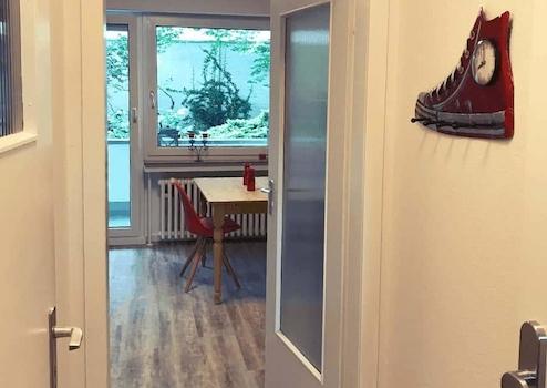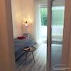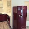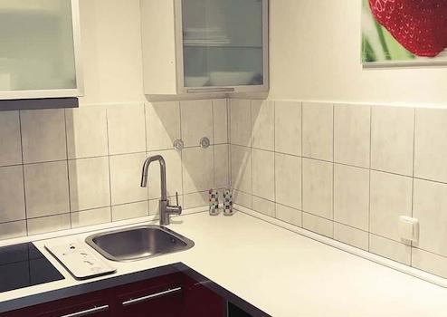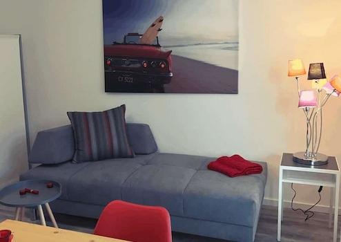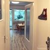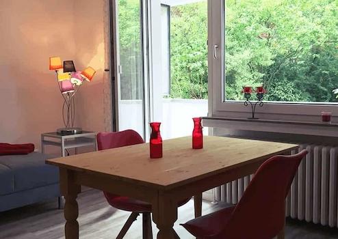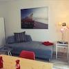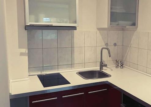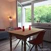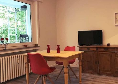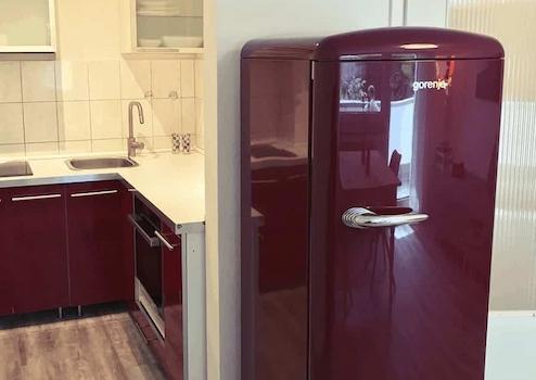 Moderne Einbauküche mit dunkelroten Türen, einem Ceranfeld, Kühlschrank und Backofen. Wohn-/Schlaf-/Arbeitsraum mit Sitzmöglichkeit zum zum Essen und Arbeiten sowie Schlafsofa, Beistelltisch, Vintage-Kleiderschrank, Jugendstil Vertiko, Sessel mit Fußhocker. Neues hell gestaltetes Bad mit Duschwanne. Flur mit Vintage Garderobe. Böden mit Laminat, Fliesen. Internetzugang vorhanden.