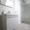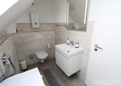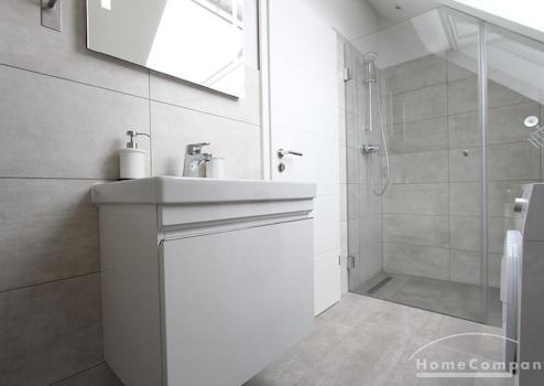 Grau-weiß gefliestes Tageslichtbadezimmer mit bodentiefer Dusche. Eine Waschmaschine steht zur Verfügung.