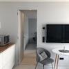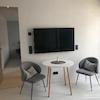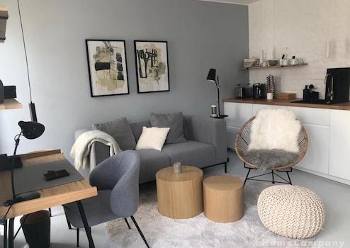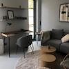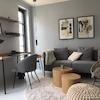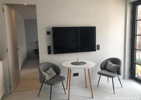 Sie gelangen über einen schön gestalteten Hof durch eine Tür in einen kleinen Stadtgarten, der wie eine Terrasse für das Apartment wirkt. Dort befindet sich auch der Zugang zur Wohnung durch eine sprossenverglaste Fenstertür: Sie betreten den Wohnraum mit moderner Küchenzeile, Essecke und gemütlicher Sitzecke in elegantem Grau mit hellen Accessoires und Tischelementen in Holzoptik, die dem Raum Stil und Behaglichkeit verleihen. An der Wand befindet sich ein großes Smart-TV-Gerät (Netflix incl.).