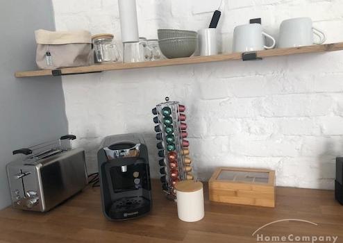 Die großzügige Küchenzeile ist komplett eingerichtet mit Induktionskochfeld, Kombigerät mit Backofen, Mikrowelle und Grill, Spülmaschine, Kaffeeautomat und entsprechendes Koch- und Essgeschirr.