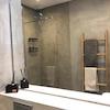 Eine blickdichte Glastür führt ins Duschbad mit Regendusche, Waschtisch mit großem Spiegel und WC. Es gibt ein Deckenlicht über dem Waschtisch, das Tageslicht spendet.