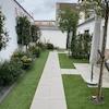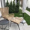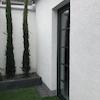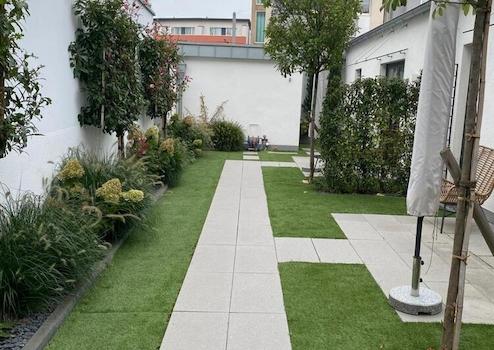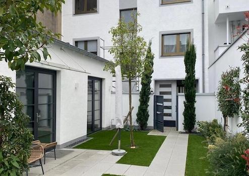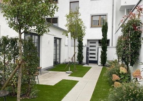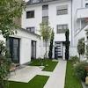 Schicke Zwei-Zimmerwohnung mit moderner Ausstattung und technischen Details: Bewegungsmelder und Videosprechanlage, Fußbodenheizung, automatische Bewässerungsanlage für die kleinen bepflanzten Beete im Terrassenbereich, der mit kleinen Lampen romantisch beleuchtet ist.