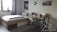 Ein großer Wohn-Schlafraum, der mit einem 140er Bett, einem schönen Holzkleiderschrank, TV-Gerät, angrenzender Pantryküche und einem praktischen Tresen ausgestattet ist.