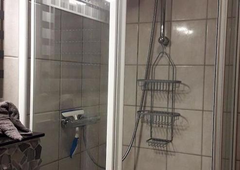 Grau-weiß gefliestes Tageslichtbadezimmer mit Dusche.