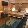 Kombinierter Wohn- und Schlafraum mit einem Doppelbett (200x200 cm). einem Sofa, einem Flat-Screen ausgestattet.