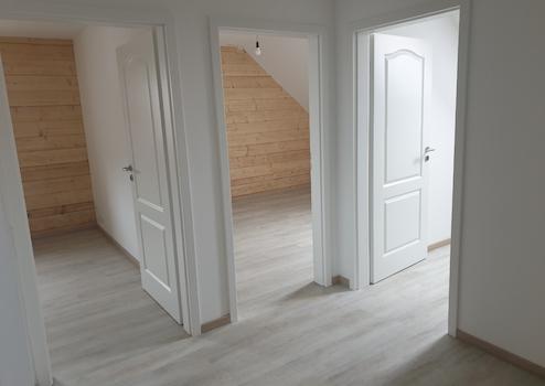 Die Trennwände sind verspachtelt, geschliffen und fachgerecht in weiß gestrichen. Die tragenden Wände sind aus Massiv KVH-Holz montiert sind geschliffen und dürfen nicht weiterbearbeitet werden.
