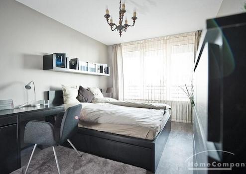 Das Schlafzimmer besitzt ein großes Doppelbett und einen Kleiderschrank mit genügend Stauraum. Durch die großen, mit moderner Isolierverglasung versehenen Fenster ist die Wohnung trotz der Lage an der Leipziger Straße ruhig und hell. Das Badezimmer ist funktional und modern.