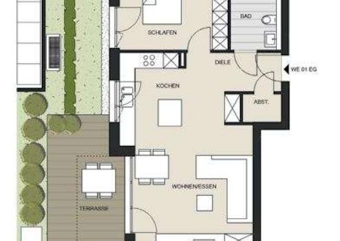 Hier bieten wir die WE 1 im Erdgeschoß an. Ein moderner Grundriss mit einem großzügigen Wohnraum mit offener Küche und einer großen Terrasse lassen Platz zum Kochen, Essen und Wohnen. Ein ruhiger Schlafraum und ein schickes Badezimmer runden diese Wohnung ab.