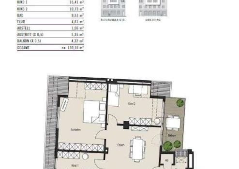 Im 6. OG empfängt Sie eine gepflegte vermietete Vier-Zimmer-Wohnung mit einer großzügigen 130 qm Wohnfläche und gediegener Ausstattung sowie Balkon Richtung Westen. Über eine Diele betreten Sie die Wohnung, von der das Badezimmer sowie ein Abstellraum zu erreichen sind. Weiterhin erreichen Sie einen großzügiger Wohn- und Essbereich mit einer offenen Küche und einem weiteren kleinen Balkon Richtung Ubierring. Drei weitere gut geschnittene Räume, die derzeit als Arbeitszimmer, Schlafzimmer und Gästezimmer genutzt werden ergänzen diese Etage.
