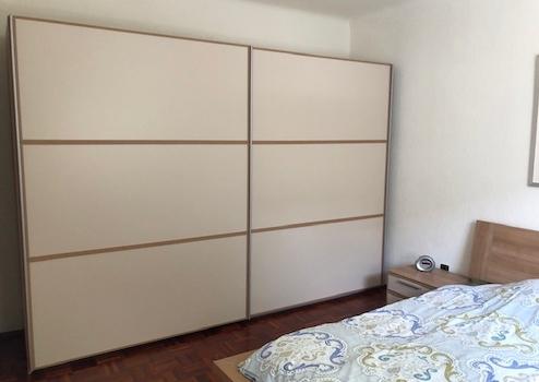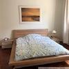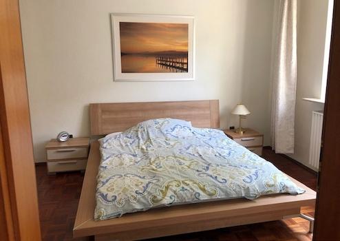 Der Schlafraum mit modernem Doppelbett und großem Schrank bildet den Rückzugsbereich. Das helle Duschbad und das separate WC vervollständigen diese geräumige Wohnung.