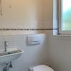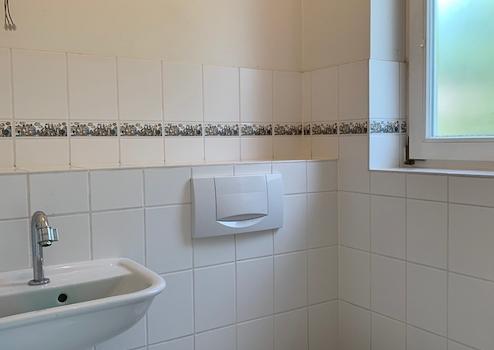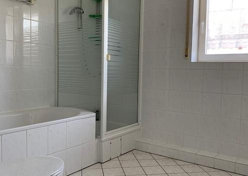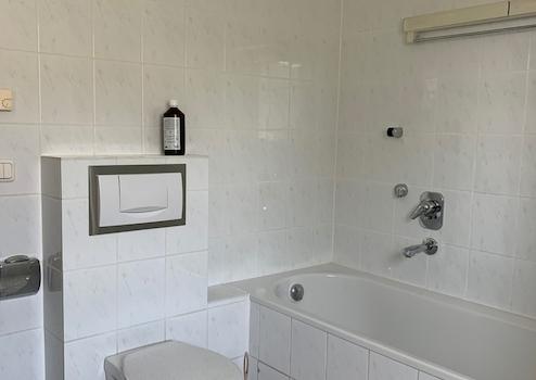 Direkt angrenzend an das Elternschlafzimmer befindet sich ein Badezimmer mit Wanne und WC. Das Badezimmer wirkt sehr hell. Das Badezimmer ist hell gefliest.