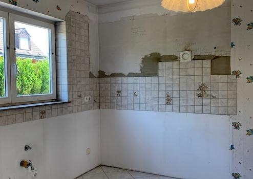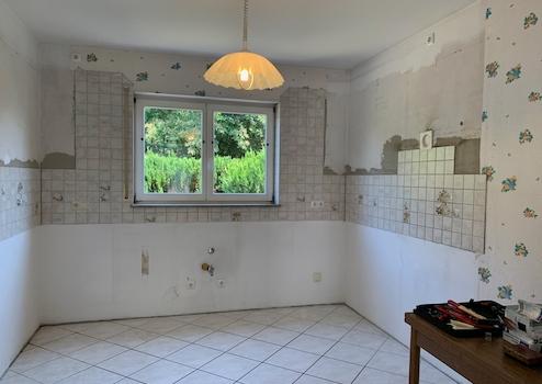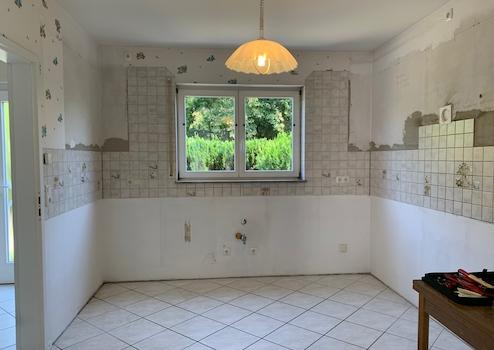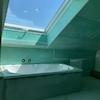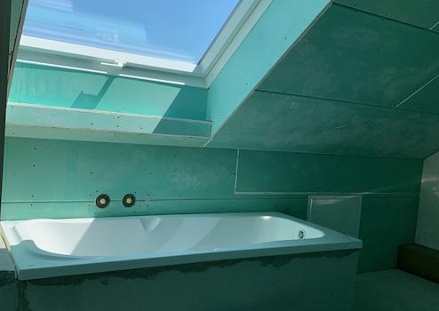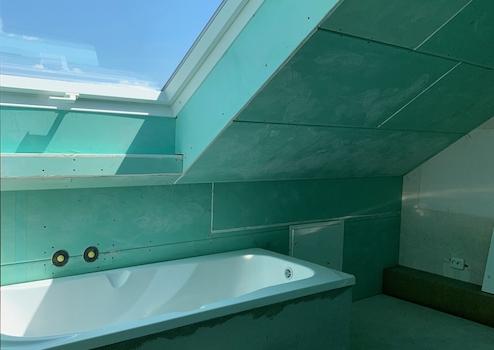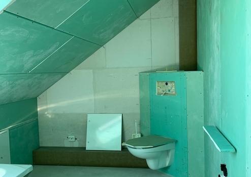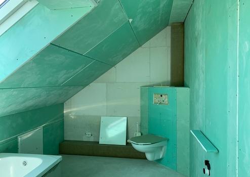 . das Badezimmer im Dachstudio (mit Wanne und WC) ist vorbereitet; Maler,- Spachtel und Fliesenarbeiten