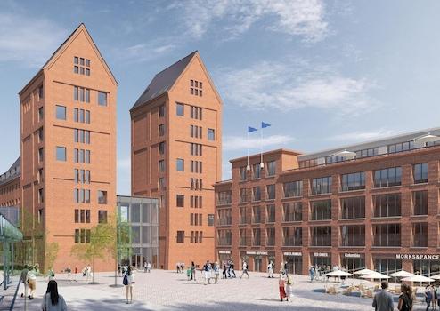 Besonders herausragend und stadtbildprägend sind hierbei die beiden Speichertürme mit dem angrenzenden Sackspeicher. Der historische und denkmalgeschützte Doppelspeicher mit seinen 40 m hohen Türmen erhebt sich gefällig über die restliche Hafenbebauung hinaus . Die Architektur erinnert zusammen mit dem angrenzenden Sackspeicher an einen klassischen Dombau mit 2 Türmen und einem Kirchenschiff. Diese Gegebenheiten inspirierten zu einer ungewöhnlichen Nutzung der historischen Gebäude und bieten ein exklusives Zuhause für alle, die das ganz Besondere lieben.