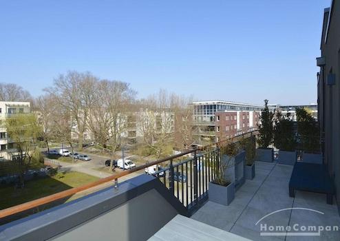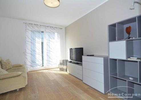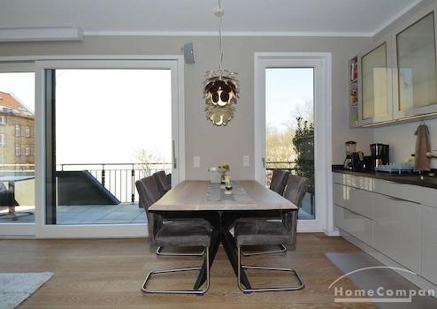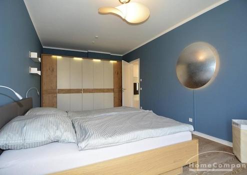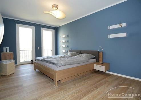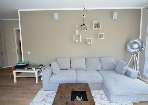 Geräumige, möblierte Drei-Zimmer-Wohnung auf etwa 98 Quadratmetern, mit bodentiefen Fenstern und 14 Quadratmeter-Balkon auf der Westseite. Die Wohnung ist sehr hochwertig eingerichtet und bietet eine große Designerwohnküche mit Geschirrspüler, integriertem Ofen und Mikrowelle, großem Kühlschrank, viel Stauraum. Es gibt eine Heimkinoanlage mit UHD/4K-Beamer und automatisch runterfahrbarer Leinwand (2,30 x 1,30 Meter), vier Dolby Surround-Lautsprechern, Subwoofer und Marantz-Receiver. Zur Ausstattung gehören außerdem Kabelanschluss, High-Speed Glasfaser-Internet (bis zu 400 mbit Internet Upgrade), elektrische Rollos. Master-Bedroom mit Doppelbett. Gästeschlafzimmer mit Schlafcouch.