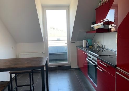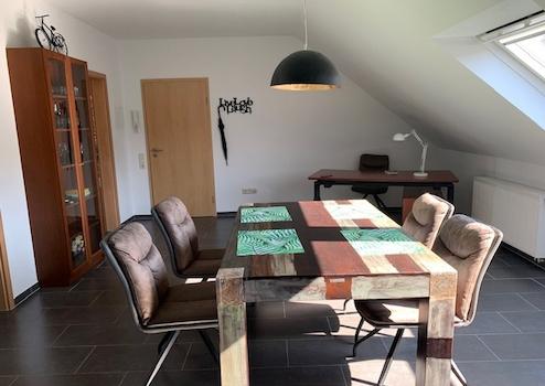 Das geräumige Wohnzimmer mit Essbereich für 4 Personen und Arbeitsplatz, sowie die gut ausgestattete Wohnküche mit Zugang zum kleinen Balkon bilden das Zentrum des Geschehens.